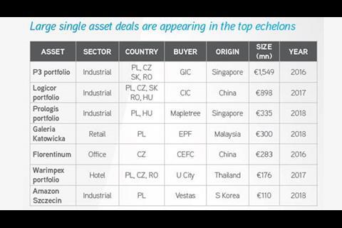So far the bulk of the capital has been spent on portfolio transactions, most notably the acquisition of the P3 logistics portfolio by Singapore's sovereign wealth fund GIC in 2016 for €1.55 bn and the Logicor portfolio, which China's CIC bought in 2017 for €900 mln. The biggest deal in 2018 was the purchase of a Prologis portfolio in Poland and Hungary by Mapletree Singapore for €335 mln.